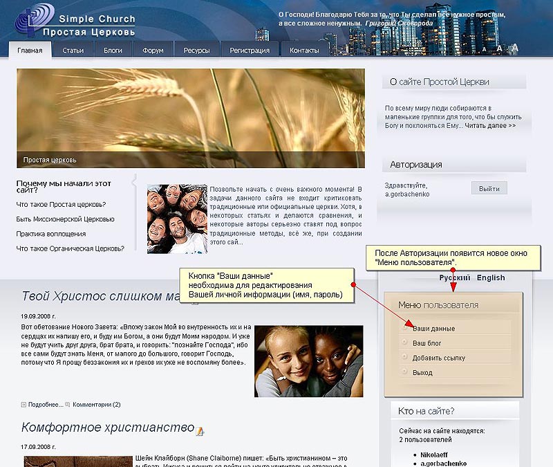 После автризации, появится новое меню, которое Вы можете использовать для изменения своей информации (имя, пароль).